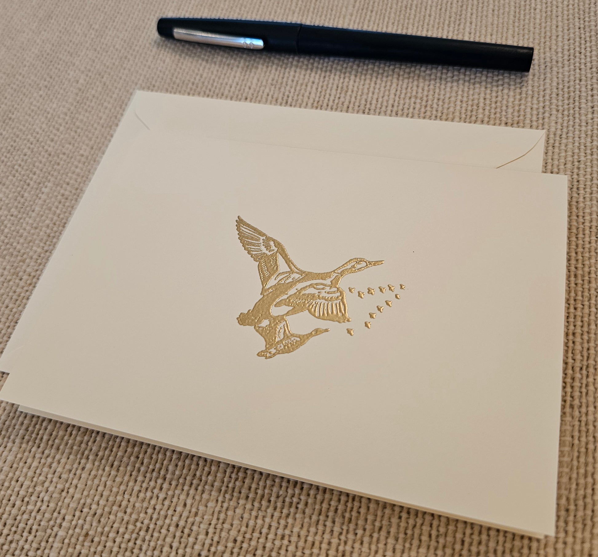 The Duck Vee Card 5 pack - Gold Embossed, elegantly designed featuring a beautifully hand-stamped golden Ducks. Perfect for adding a touch of sophistication for all of your stationery needs.